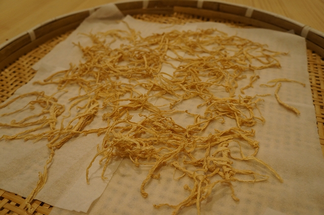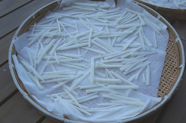 あと、先週収穫した大根で、切り干し大根に挑戦してみました。大根を千切りにして干すだけでよいらしく、始めは白くて固い大根がこんな感じになります。