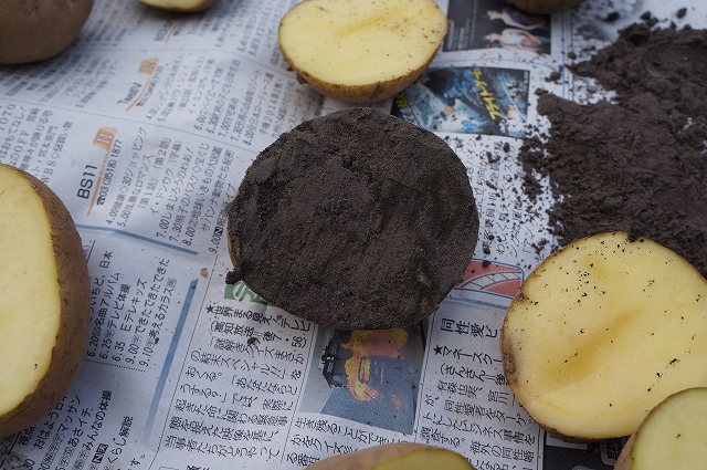 まず、植える前に種イモを適当な大きさに切って、切り口に草木灰をつけます。