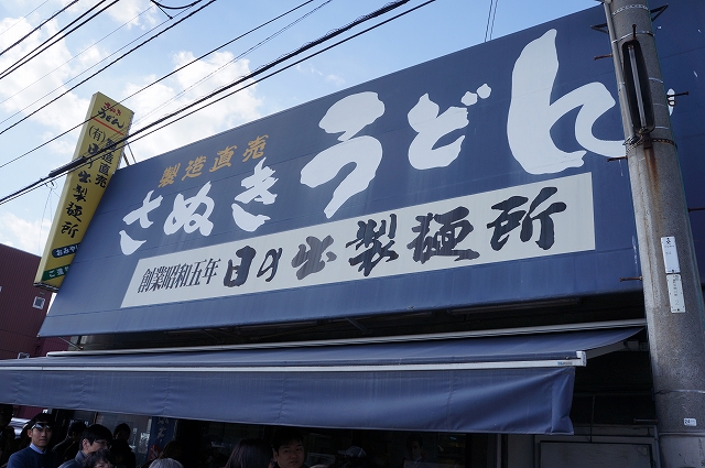 その次は、「日の出製麺所」へ。ここは、11時半から12時半の1時間だけの営業で、今日も行列ができていました。