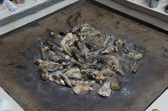 大きな四角い鉄板の上に、シャベルで殻つきのカキをのせてくれます。これを、ひたすら食べる!って感じです。カキを鉄板の上にのせると、熱で殻が開き汁がパチっと飛んでくることがあって、そのたびみんなびっくりしていました。