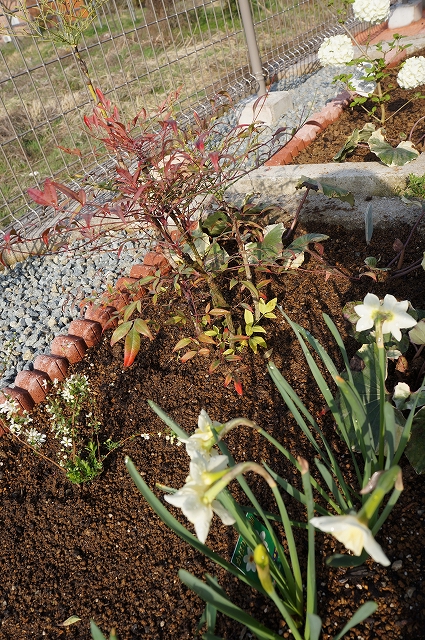 アジサイや、水仙、ツワブキに紅白南天と、和風な感じで植えてみました。