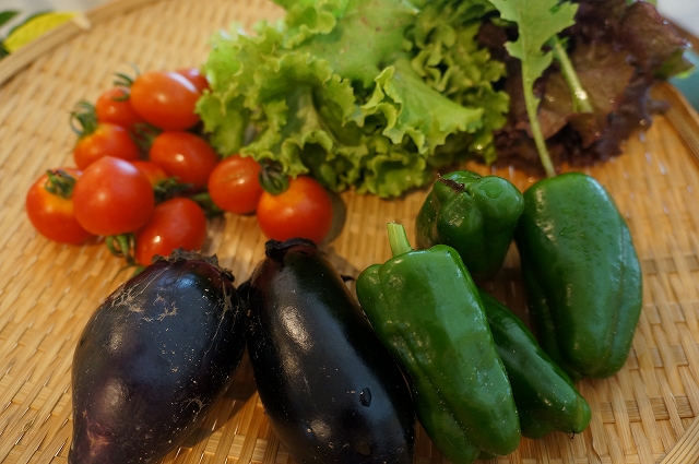 トマトやナス、ピーマン、キュウリ、そしてサニーレタスと、収穫できる野菜の種類や量も、少しずつ増えてきています。