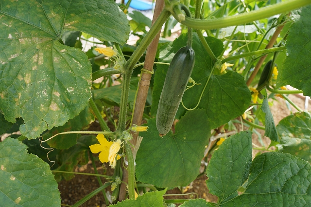 キュウリは背丈が2m位まで伸び、勢いが止まりません!節からどんどん脇芽が出てくるのを「もったいないなあ・・」と思いつつも、せっせと取っています。こうすることで、主枝の生長を促すだけでなく、風通しもよくなり病気のリスクも減らせるそうです。奥が深いです!