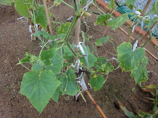 キュウリは、ほとんど葉っぱもボロボロで無残な状態でしたが、その中でも元気そうなつるを選んで誘引すると、また元気につるが伸びてきました!!すごい生命力ですね。また、たくさん収穫できるようになるといいなあ。
