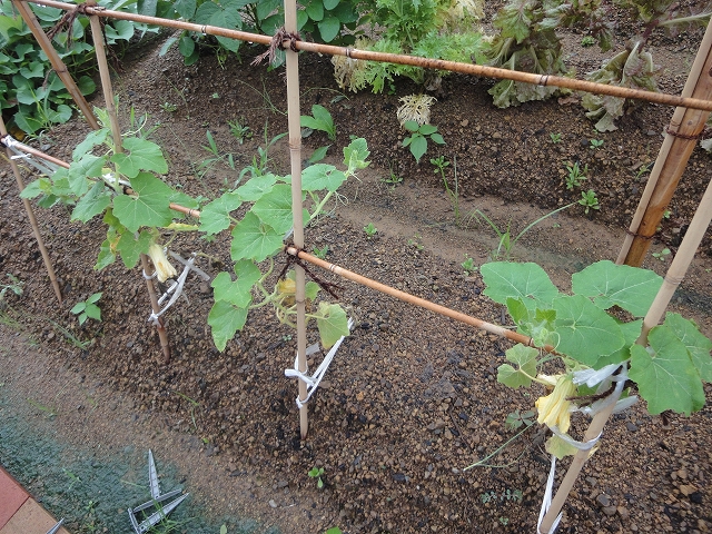カボチャのつるが、徐々に上がってきています。