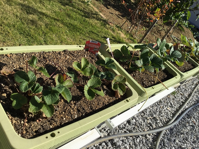 あと、イチゴの苗をプランターに植えました。新しく買った苗と、ランナーから株分けした2年生の苗です。