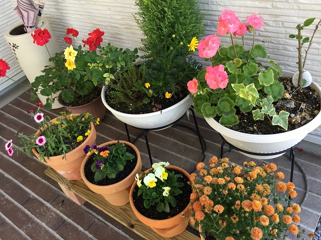 あと、玄関にパンジーの花を植えました。かわいくできました。