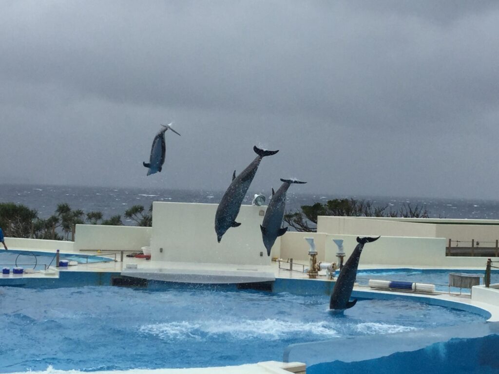 おきちゃん劇場でのイルカショーは、屋根はあるんだけど雨風が吹き込んで大変だったけど、ショーはとてもおもしろかったです。
