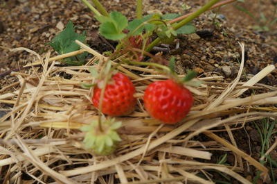 ところで、イチゴは直接土に触れると、きれいに育たないそうなので、今日、実の下にわらを敷きました。