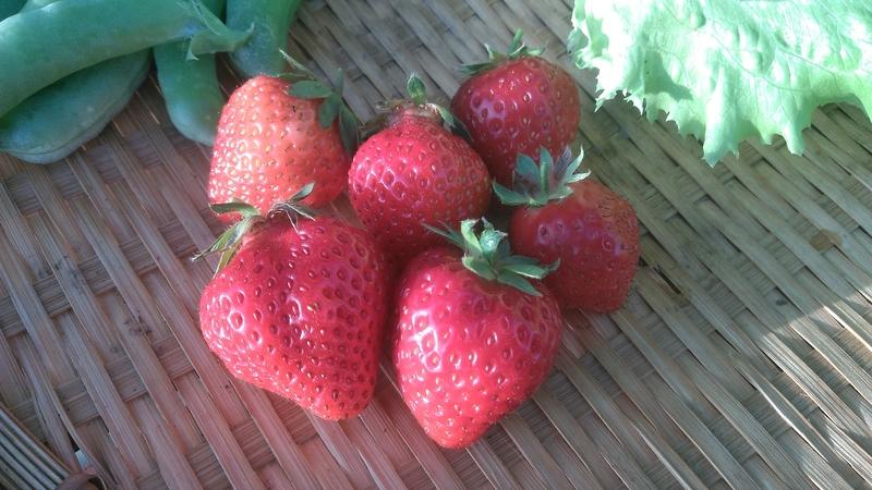 帰って、畑の水やりをしていると、イチゴが真っ赤になっているのを発見。