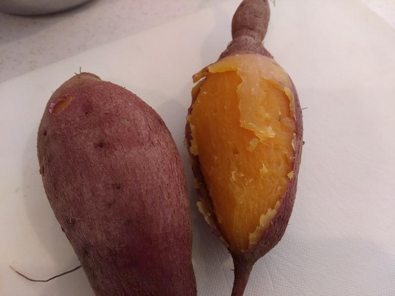 蒸した芋の皮をむいてみると・・・結構オレンジっぽい色で、びっくりしました。
