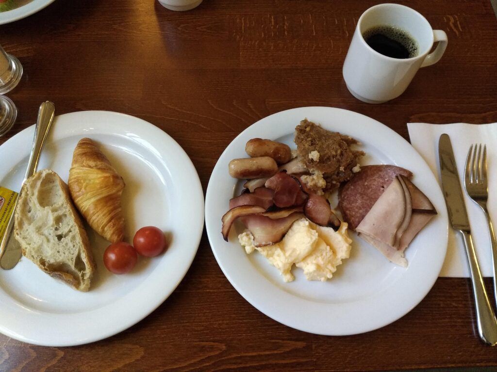 メニューは。日本と違って、ハム、ソーセージ、サラミ、ベーコンにサラダ、ヨーグルト、フルーツとボリューム感のあるメニューが中心。