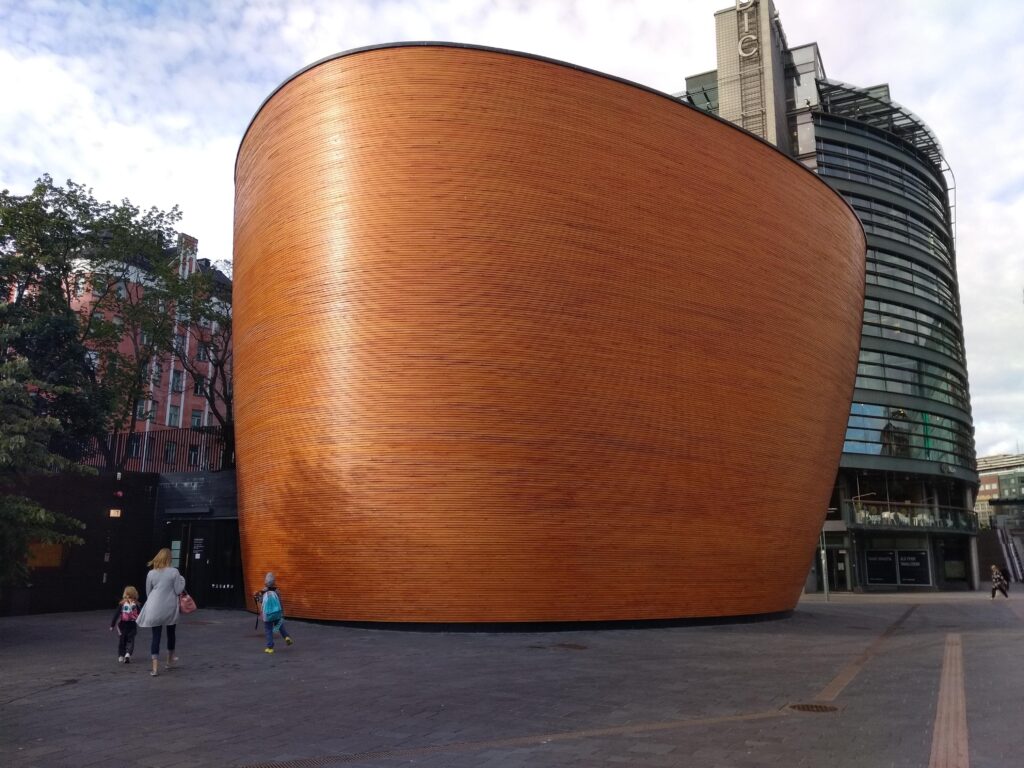 カンピ礼拝堂。街中にポツンと佇む、木製のオケのような巨大建築物。