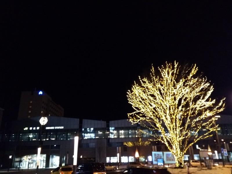 帯広駅に着いたのは、7時半くらい。駅はライトアップしていてキレイです。