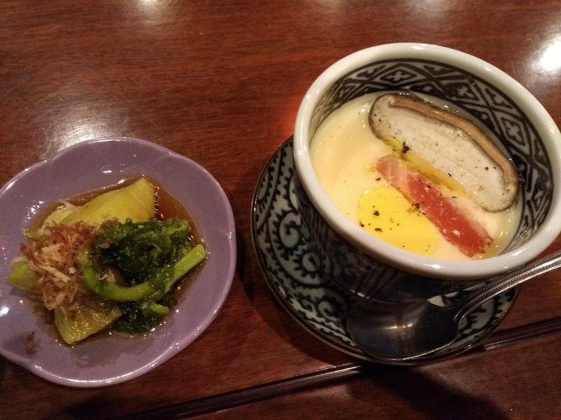 つき出しは、鳥だしの茶わん蒸し、ナスの揚げびたしでした。