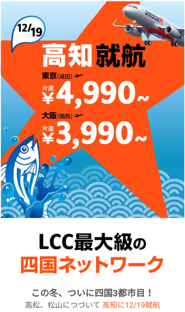 昨年末に新規就航したばかりで、高知-関西便では、安いときには片道3990円!