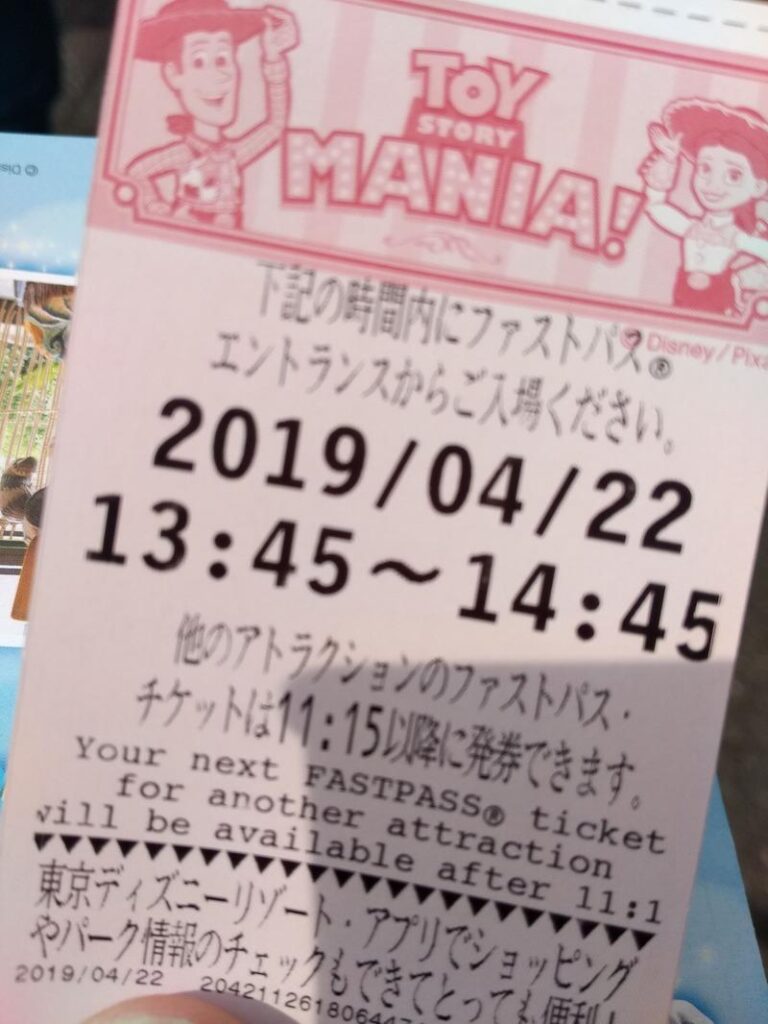 オープンと同時に入場したにもかかわらず、トイストーリーのファストパスは、13時45分!