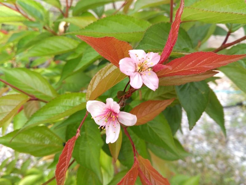 そういえば、昨年お隣さんからいただいた桜の苗木、今年背の高さくらいまで生長したのですが、なんと2輪、花が咲いていました。