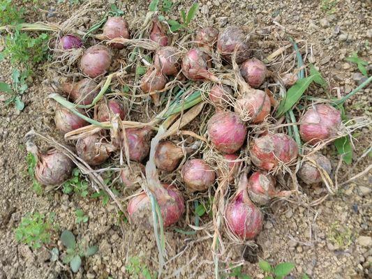 これは赤玉ねぎですが、今年も、小さいのばかりで、大きく育ちませんでした。土が悪いのかなあ・・。