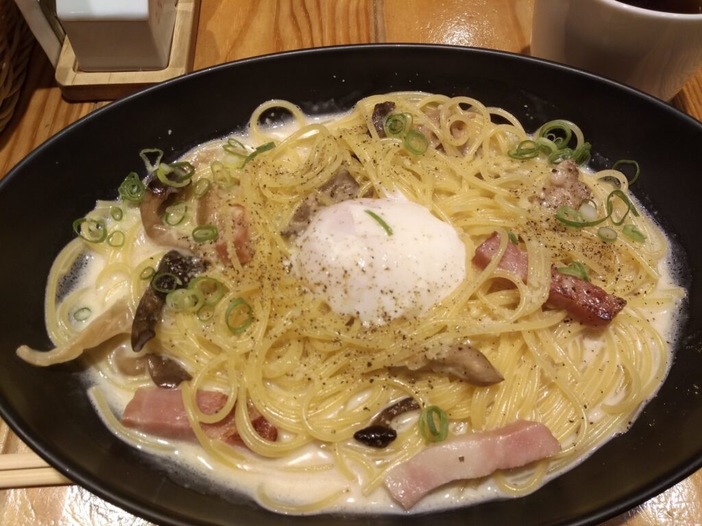 山かけ半熟卵のパスタ、和風カルボナーラです。