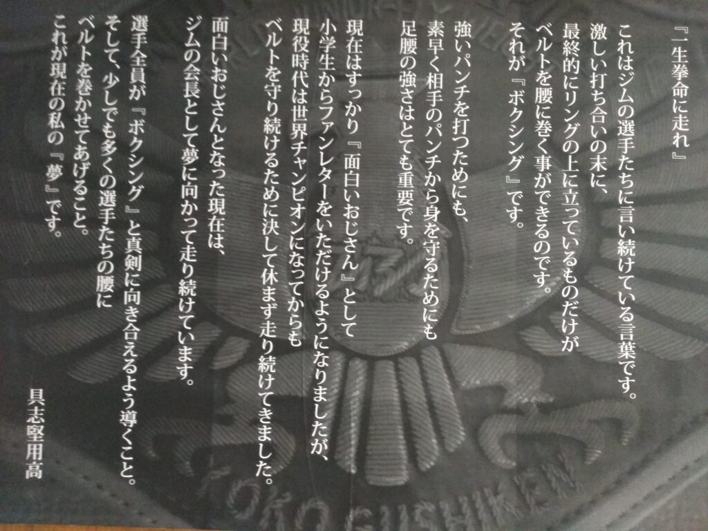 今は、ボクシングジムをやっているそうですが、「一生拳命に走れ」という教えが心に響きました。