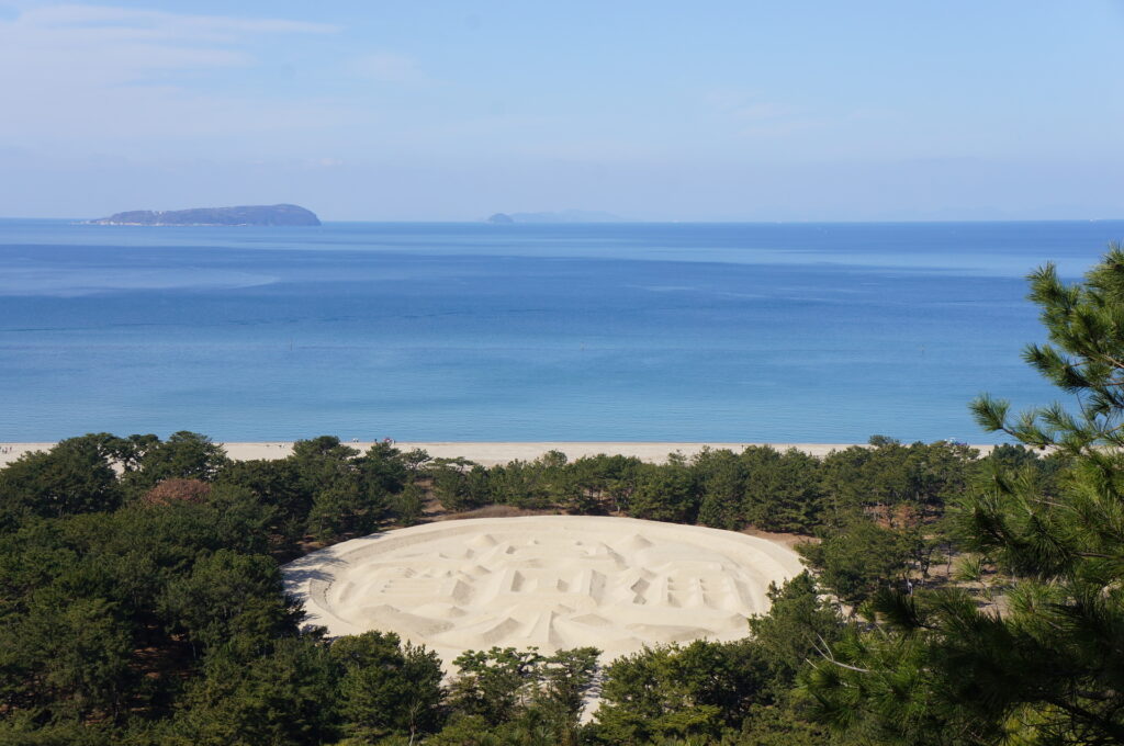 砂浜に描かれた、寛永通宝の砂絵です。展望台からの眺めは・・