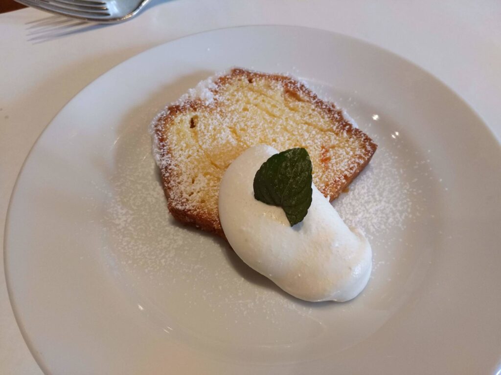 デザートは、キンカンのパウンドケーキ、キンカンの酸味と、生クリームの甘さがマッチしていておいしかったです。