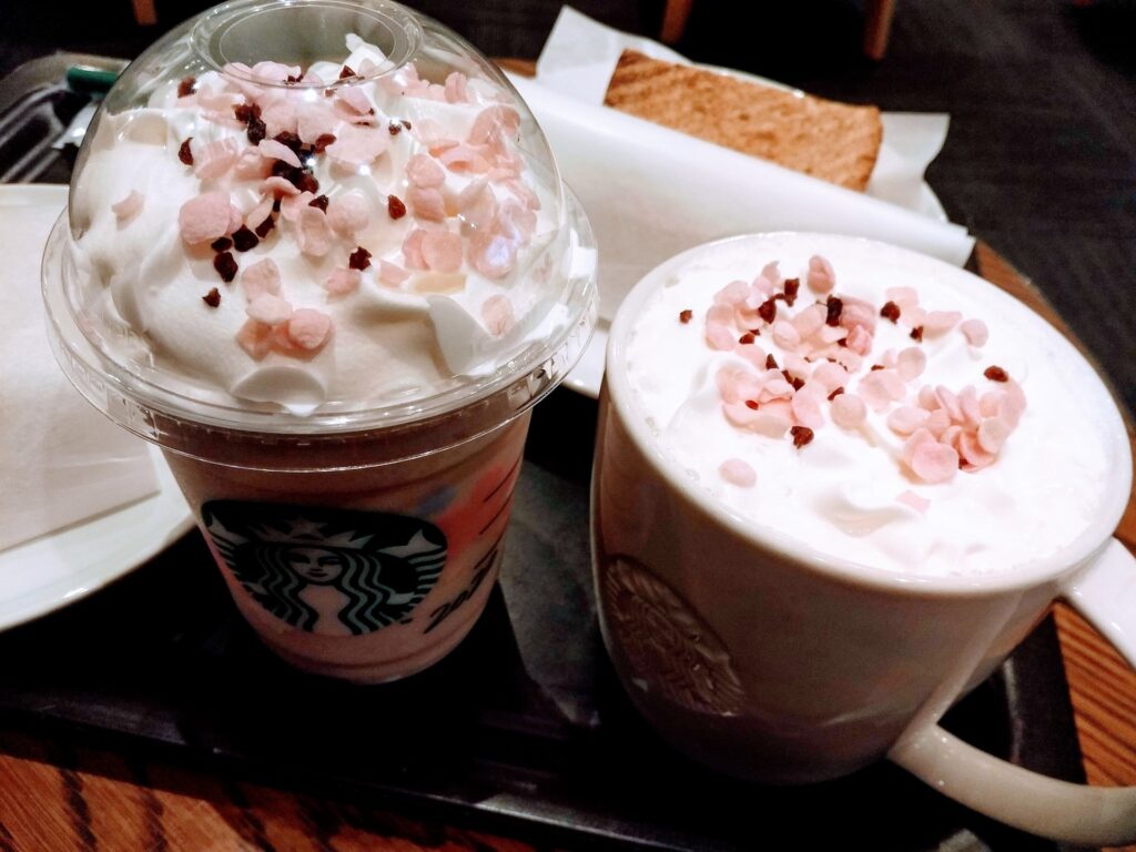さくらのラテと、フラペチーノを注文。カロリーは気になりつつも・・・・おいしかったです。