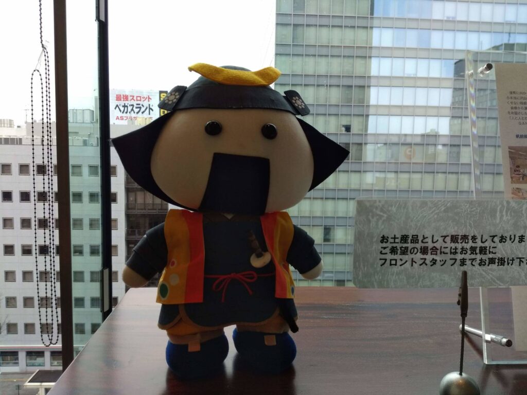 ホテルのフロントにいた手作りの「むすび丸」くん。