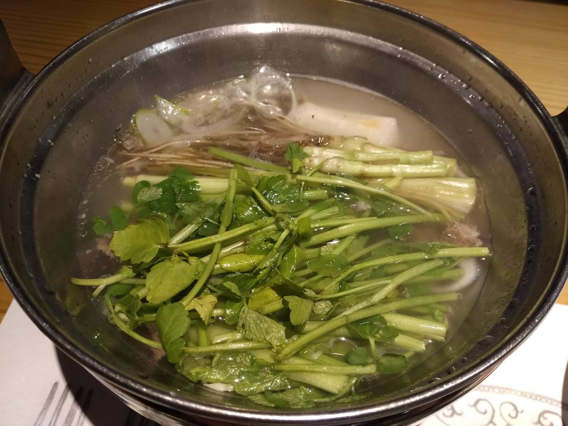 宮城県産の新鮮なせりを丸ごと根っこまで、そして、仙台牛のテールスープで食べる鍋です。