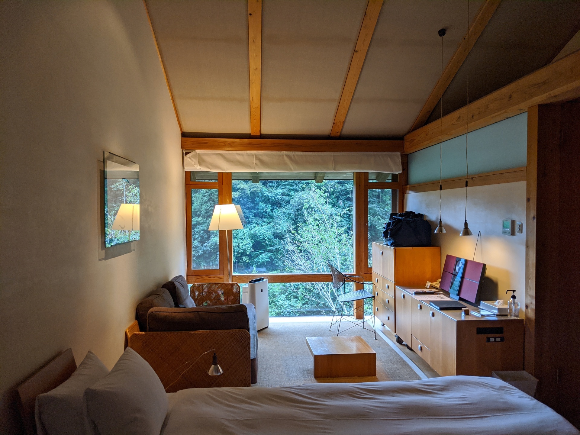 泊まる本館のお部屋からは、山と渓流の眺めが見えて、また天井が高く木の香りもして、とても落ち着きます。