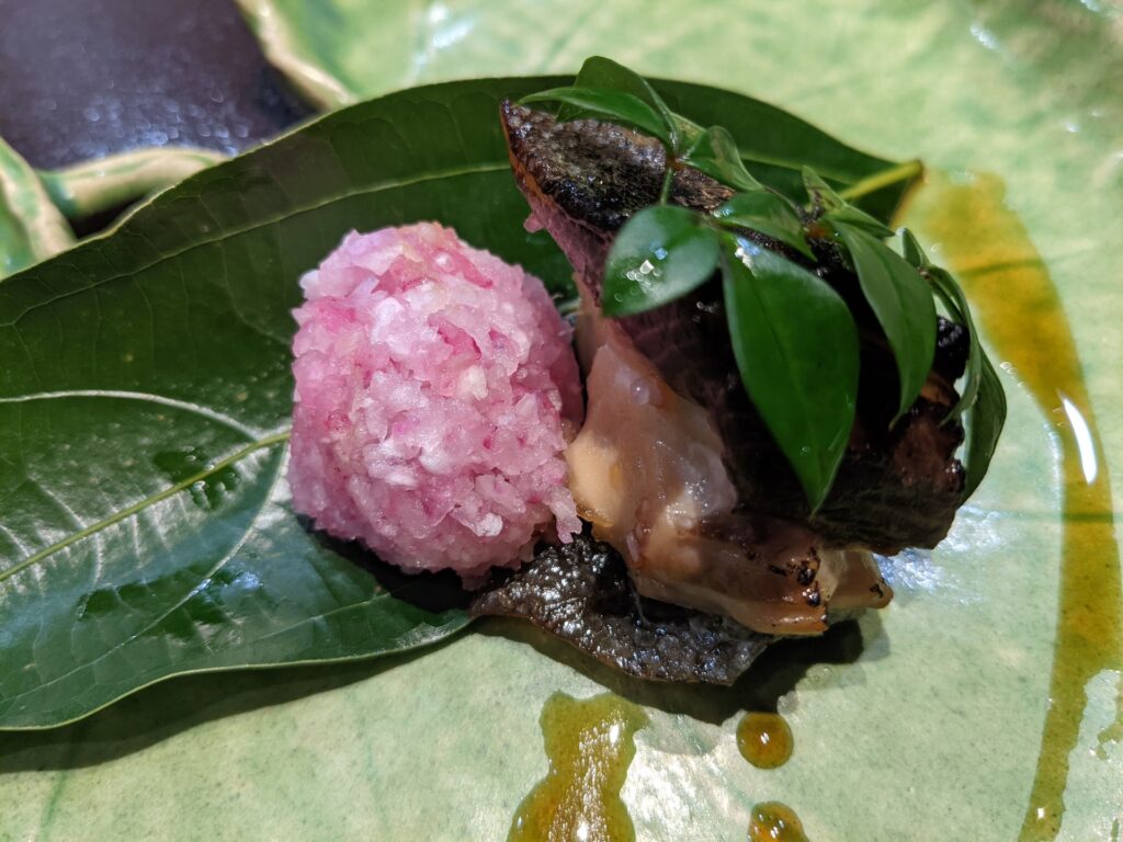 蒸し物は、カボチャのペーストの上に、シャインマスカット、フォアグラ、そして雲丹がのっていて、それに餡がからんで、すごく複雑な味でしたが、一つ一つの味がちゃんと生きていて、すごくおいしかったです。