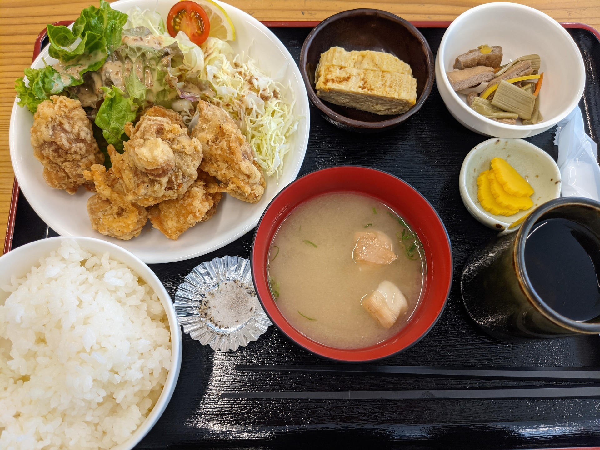 僕はから揚げ定食でしたが、焼き塩をつけて食べるのがおいしかったです。