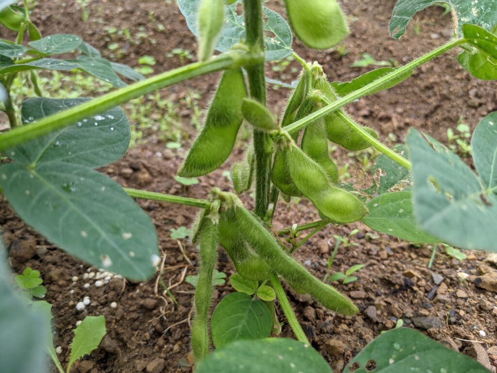 枝豆ちゃんがかわいいですね〜。まだ膨らんではいませんがちゃんと枝豆ですね。夏に食べるのが楽しみですね。