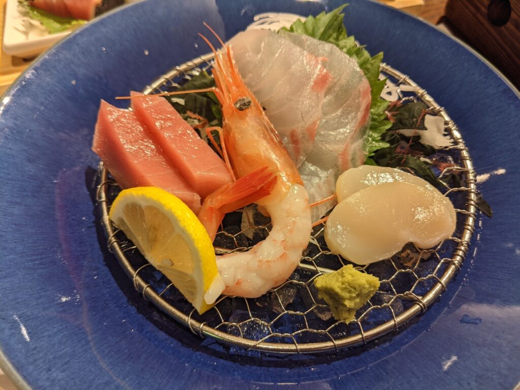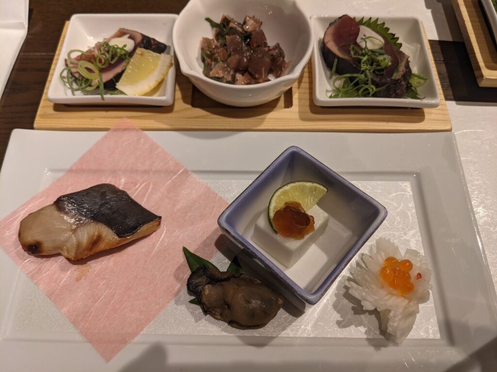 カツオのたたき3種食べ比べに、本マグロや甘えびの刺身、宮崎牛の陶板焼きにフグやアオサの天ぷら・・・などなど、どれもおいしかったですが、おなかがいっぱいになって少し苦しかったです(汗)