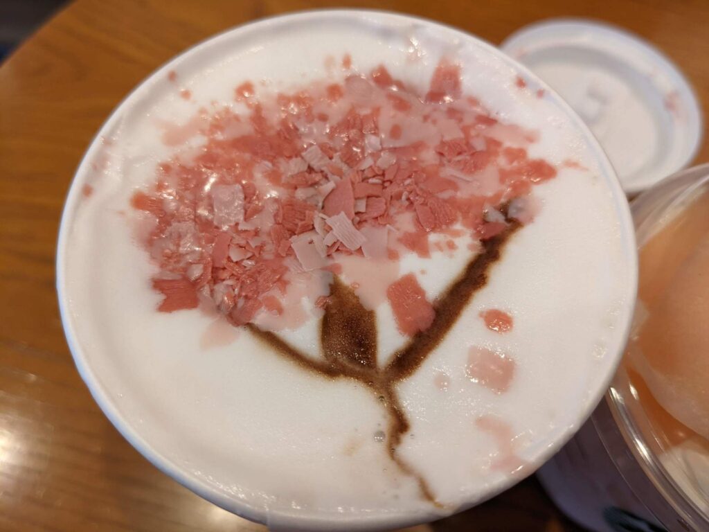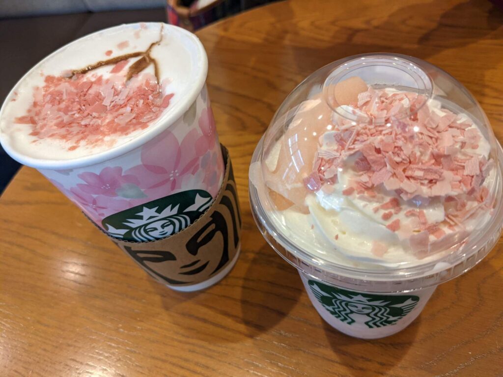 春の限定ドリンク、「さくらストロベリー白玉フラペチーノ」と「さくら咲いたミルクラテ」を注文。
