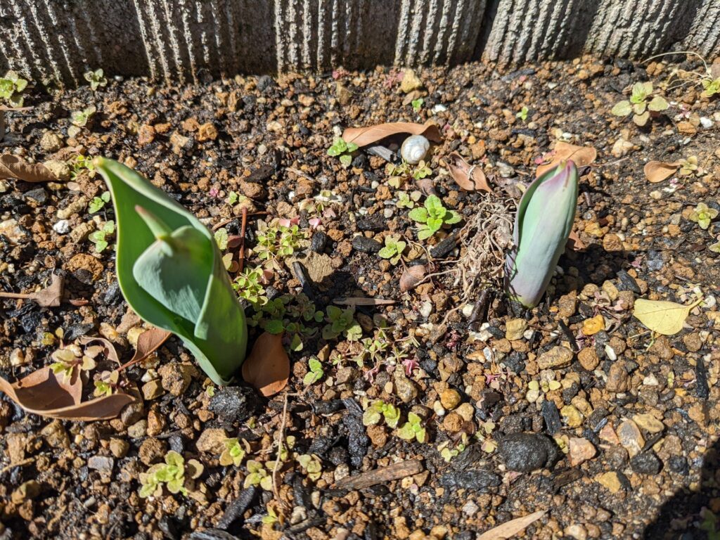 あと、秋に植えた花壇のチューリップも、芽を出しています。