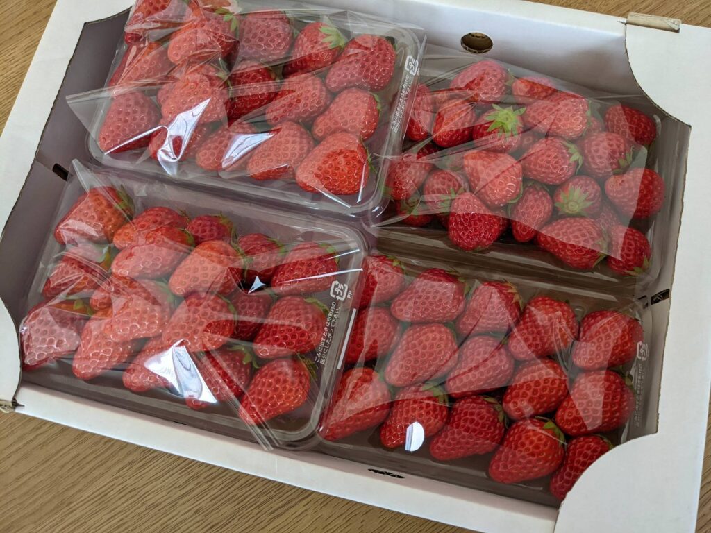 4パックで約1キロ。ヘタを取ります。きれいないちごですね。