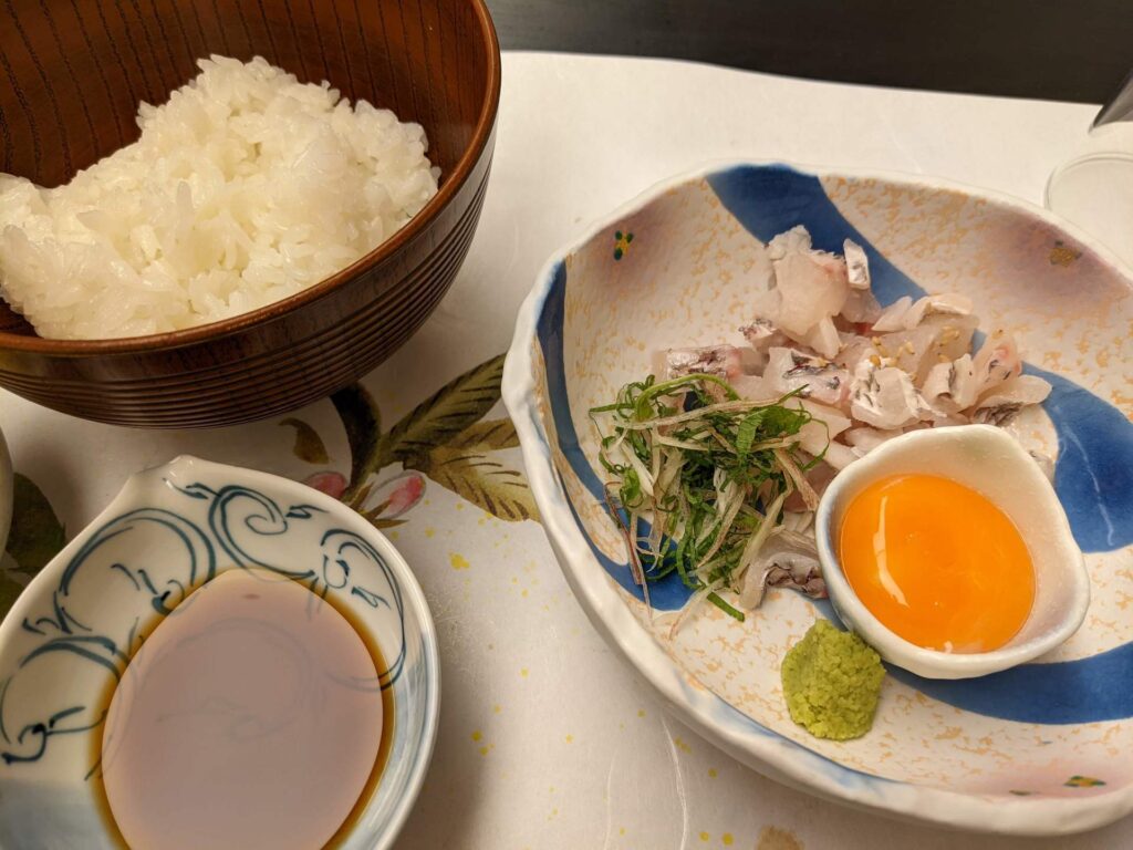 鯛と薬味、卵黄にだしをかけてかき混ぜて、ご飯に乗せて食べます。