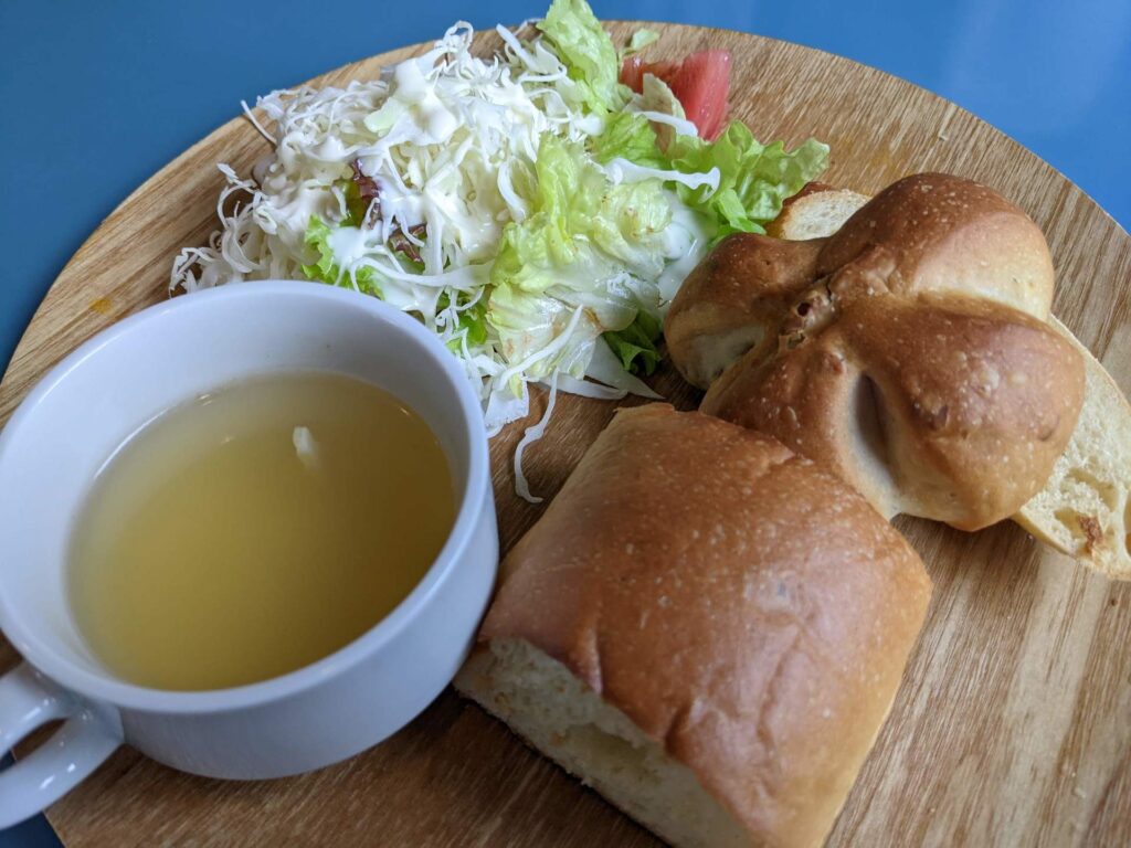 パスタランチのセット、すごい量のサラダですね。パンも3つあります。