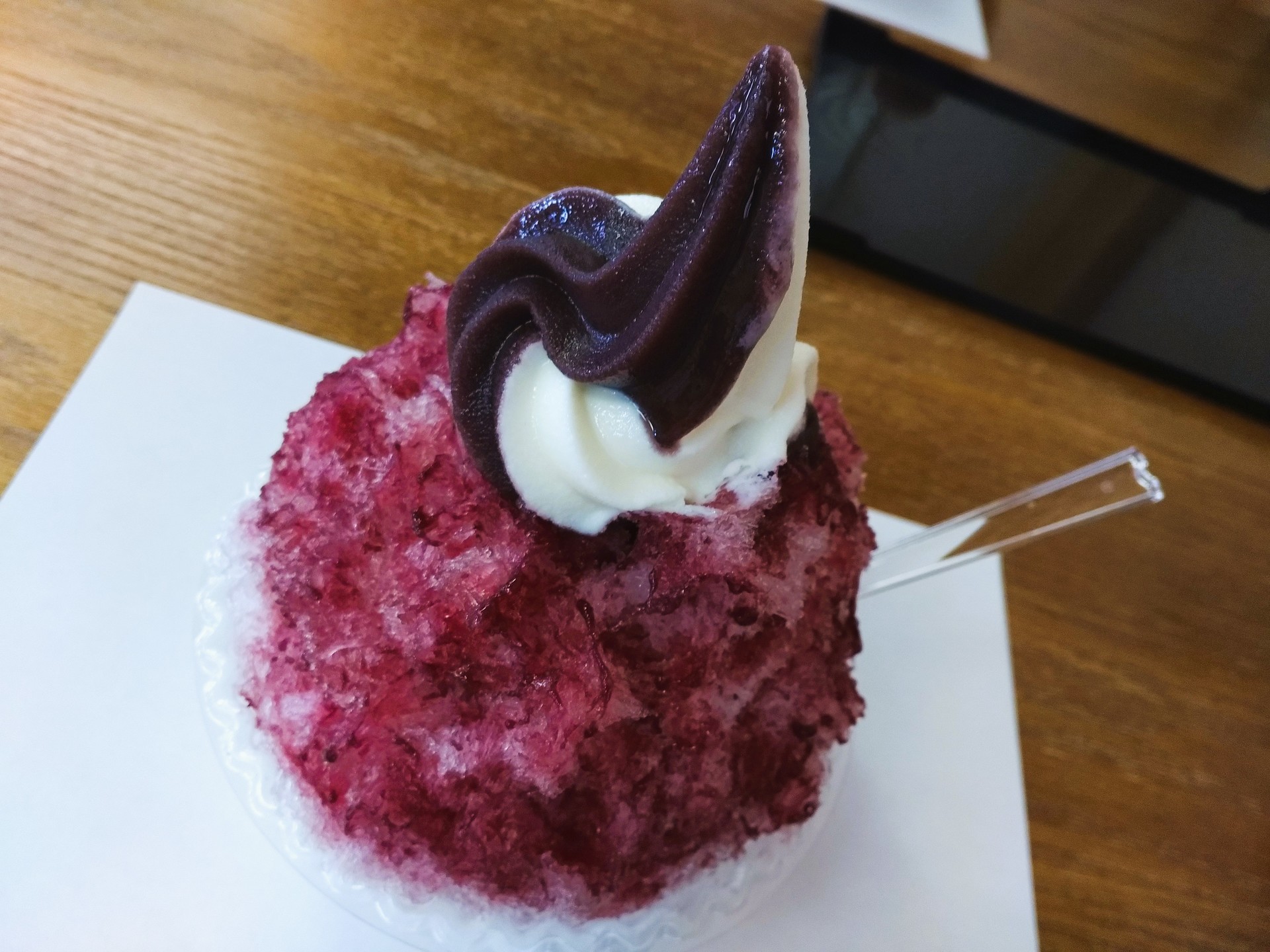 ブルーベリーのかき氷(中)プラス、ミックスソフトのトッピングでなんと!! 250円。安すぎですよね。