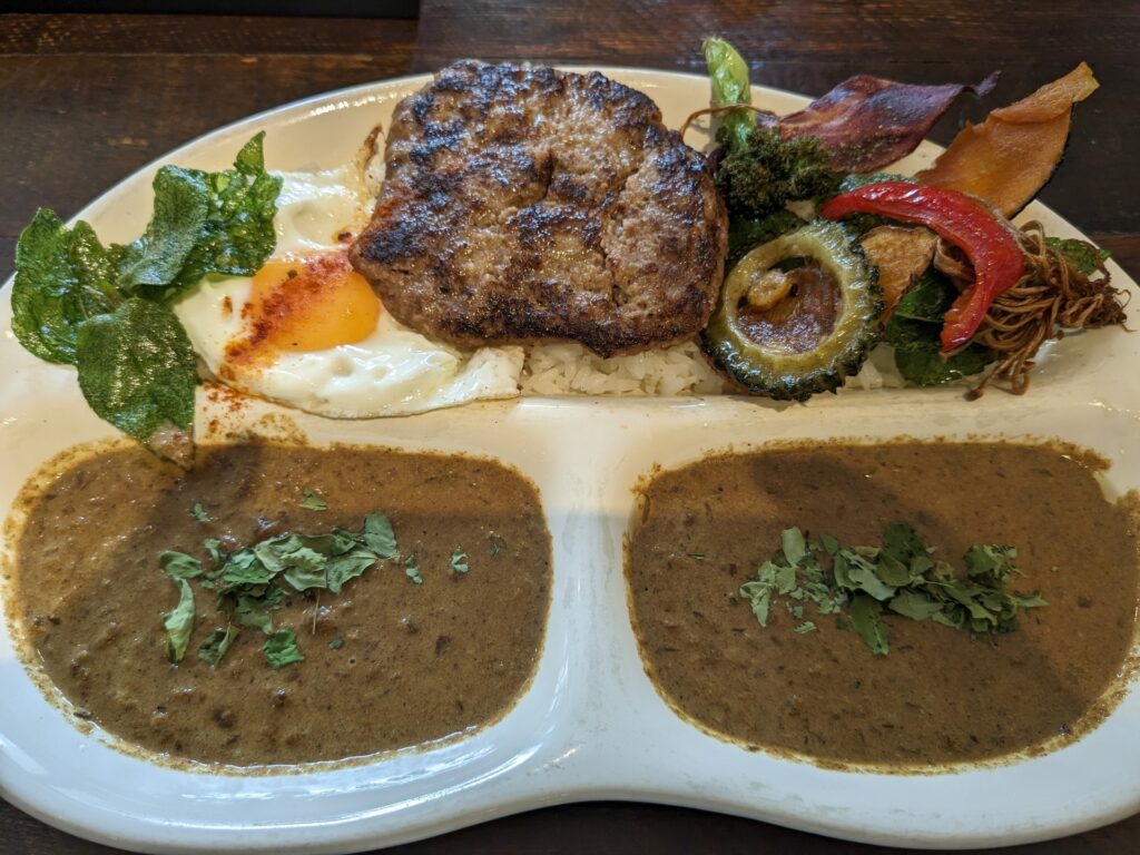 カレー自体はもちろんおいしいですが、石垣牛のハンバーグや、素揚げしたたくさんの野菜が乗っていて、食べたことのない感じのカレーでした。すごくおいしかったです。
